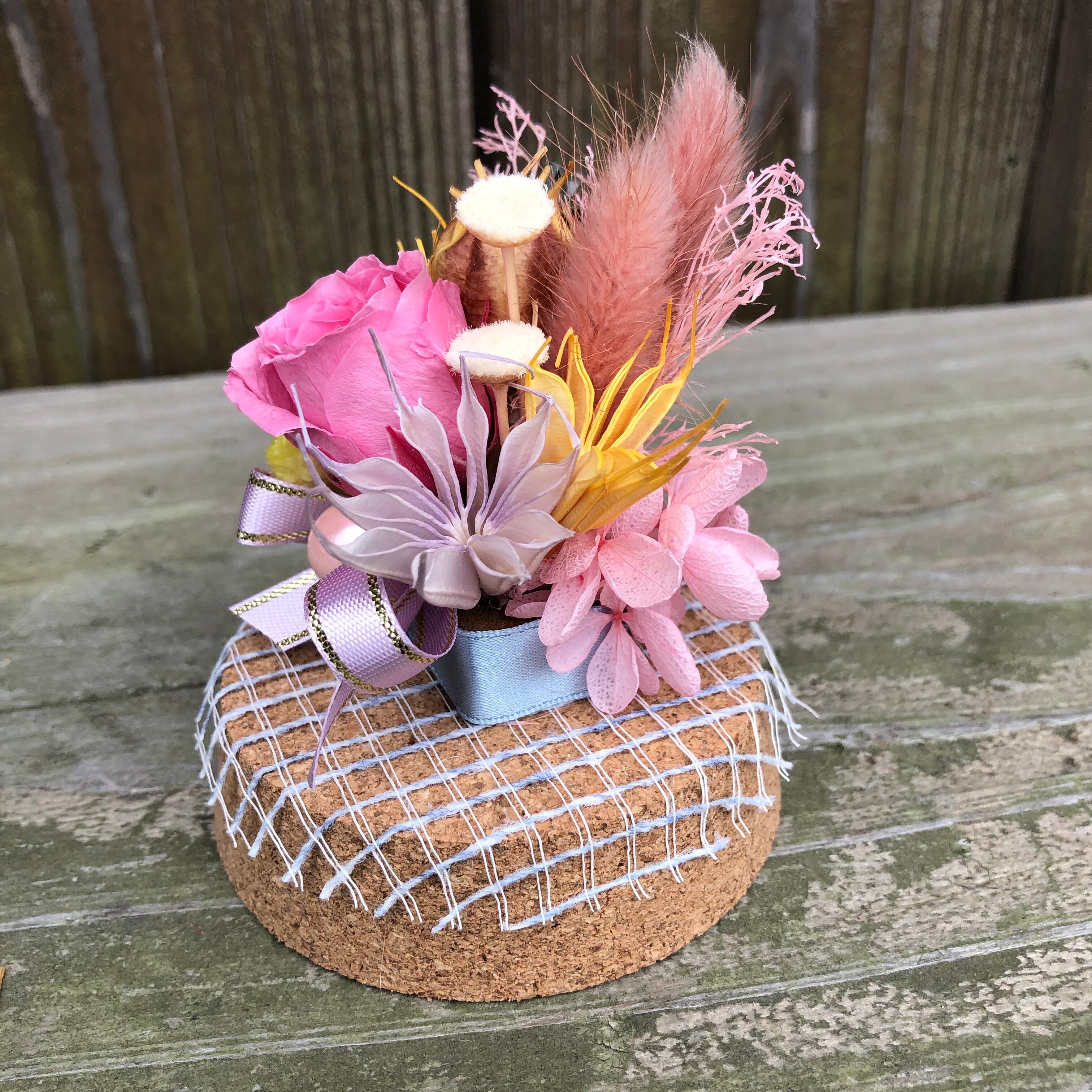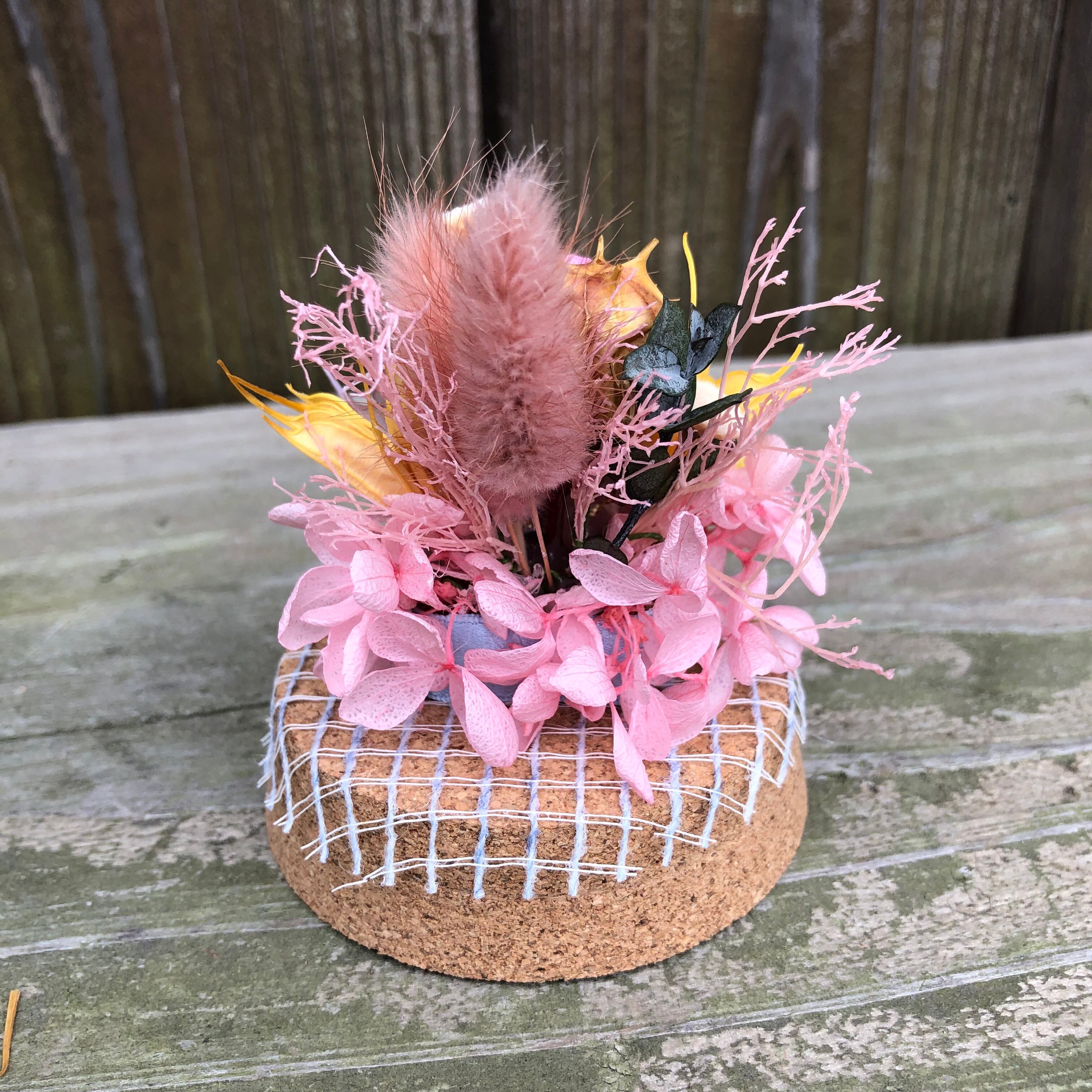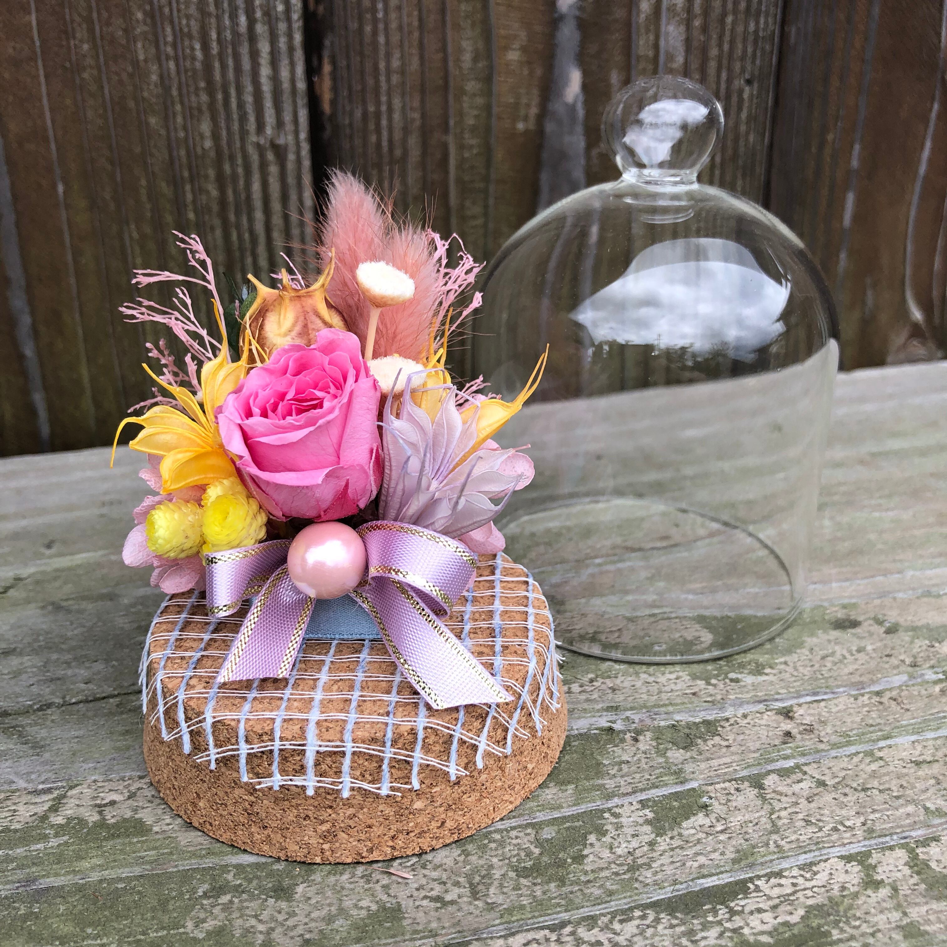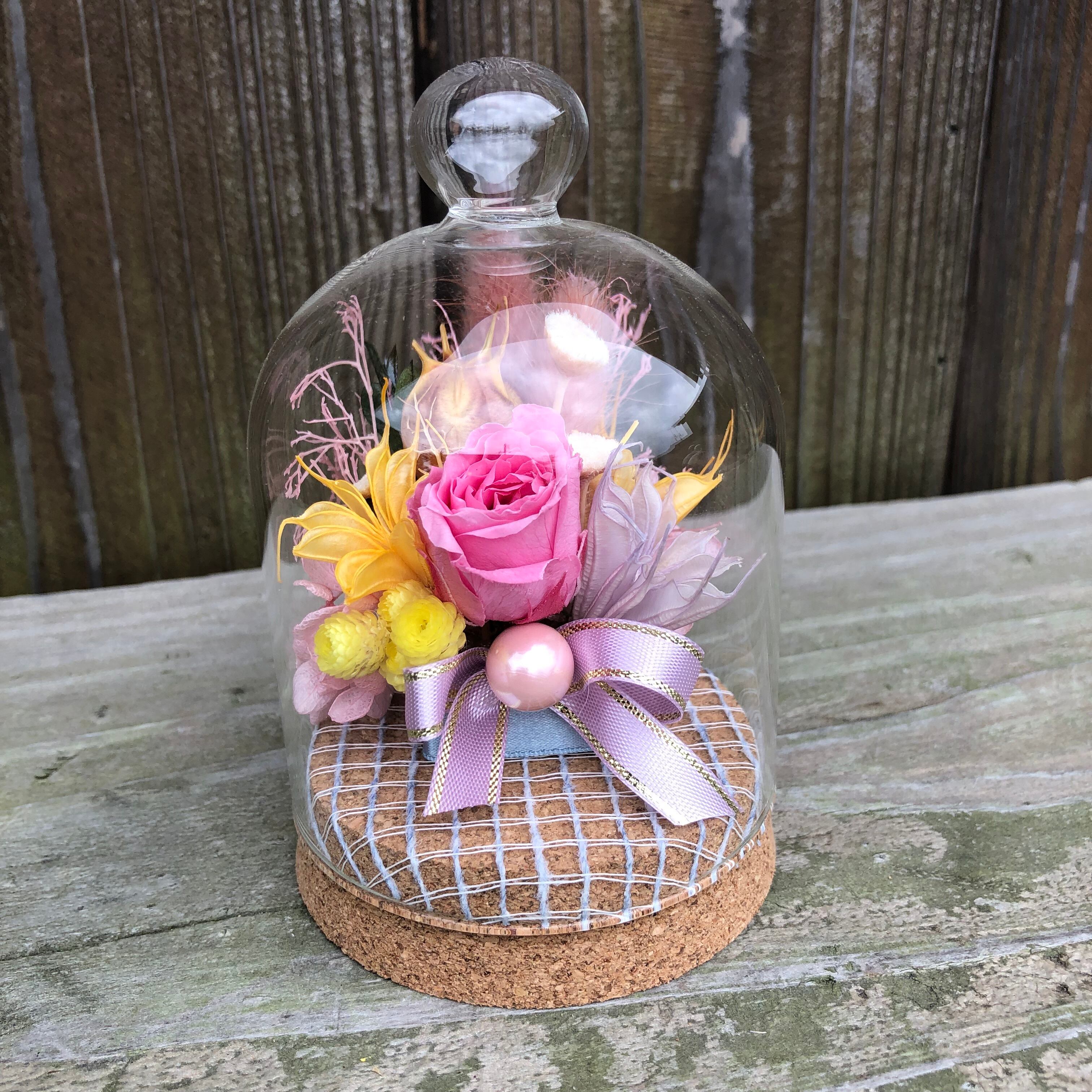 ガラスドームの中に入ったかわいいプリザーブドフラワーのアレンジメントです。