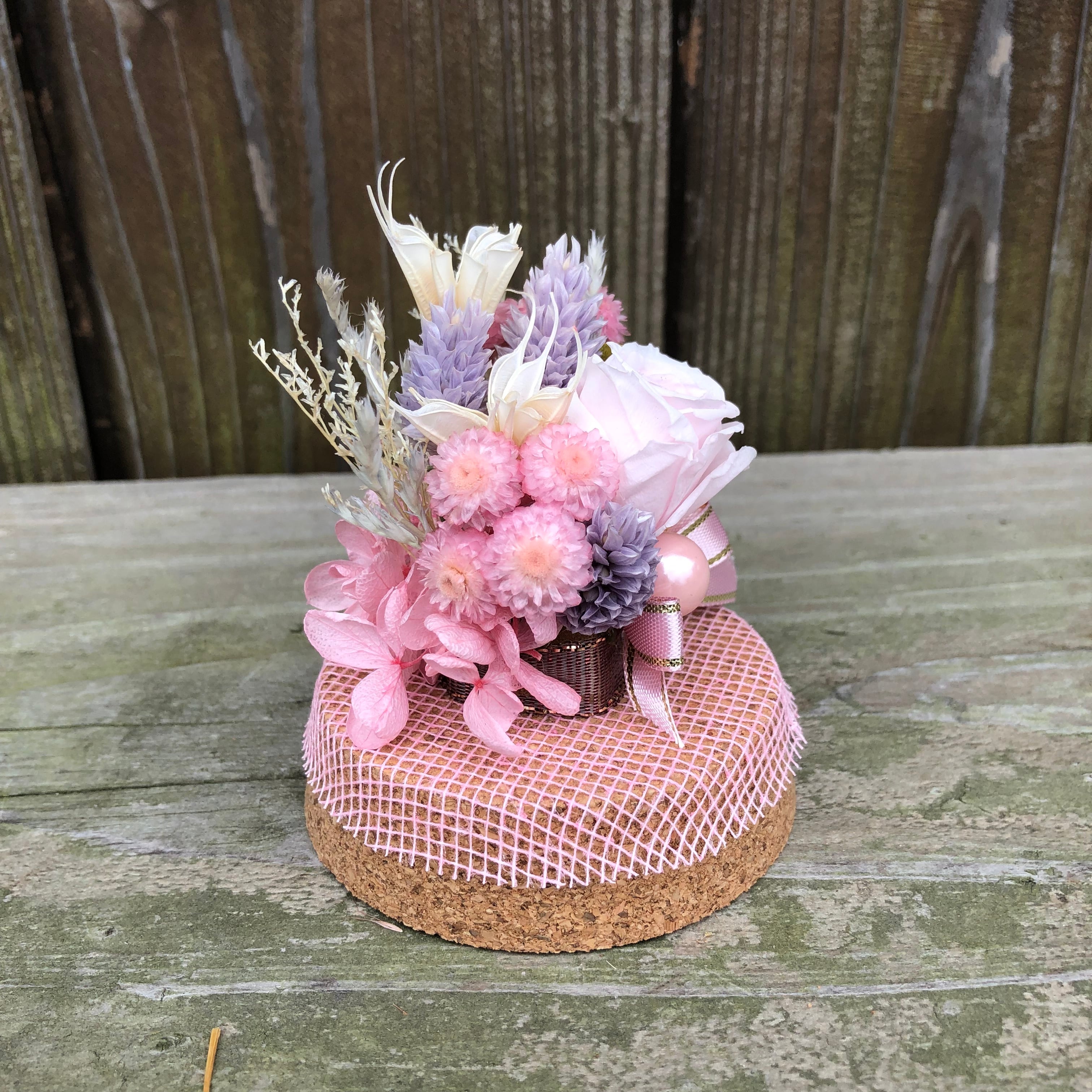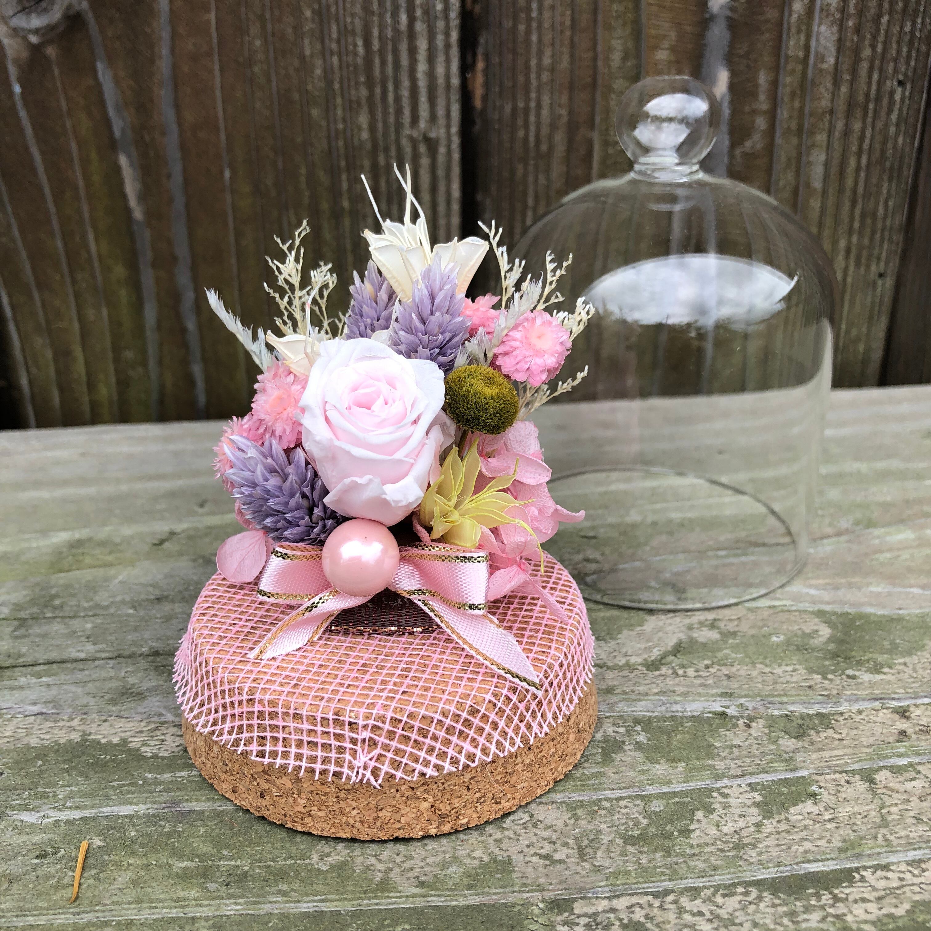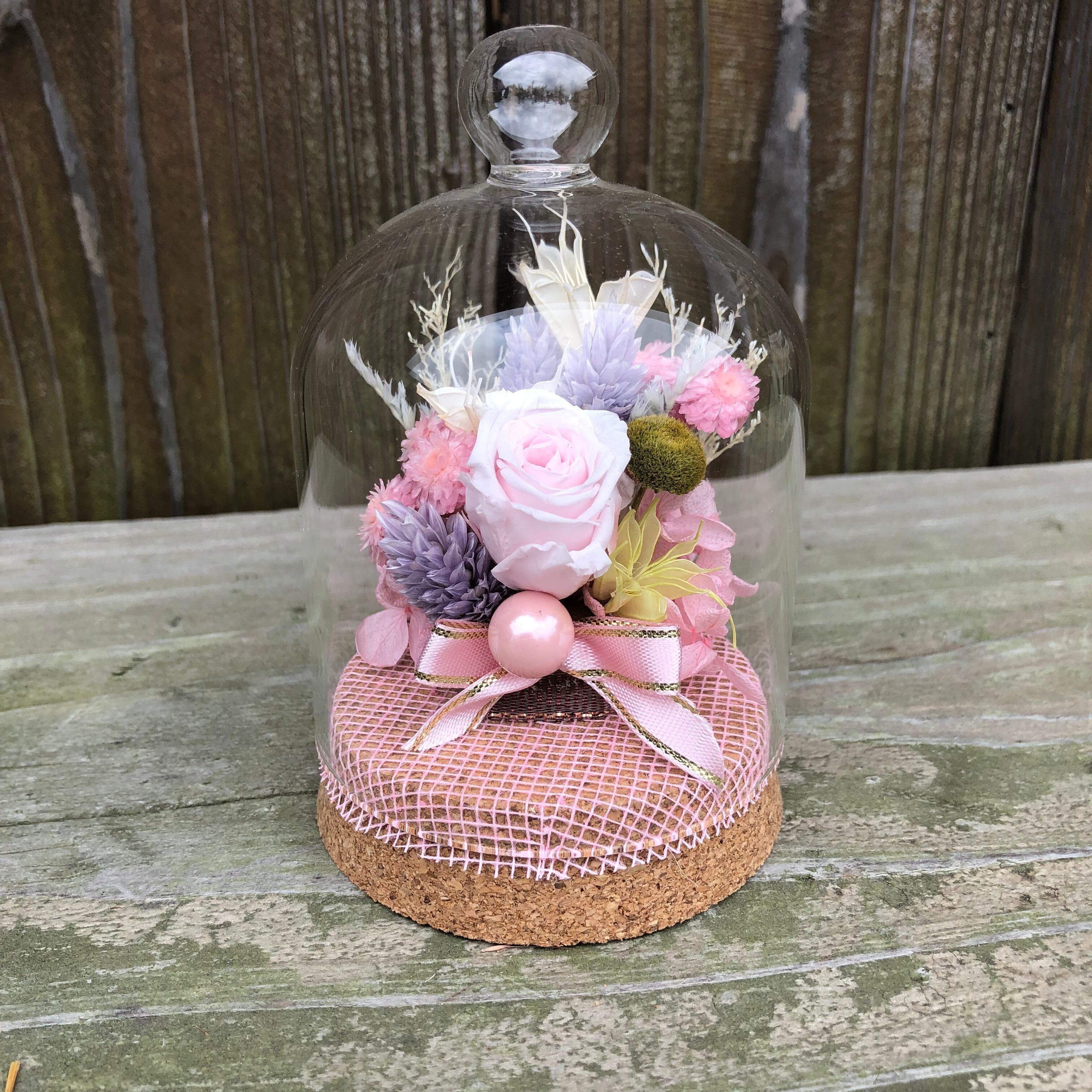 ガラスドームの中に入ったかわいいプリザーブドフラワーのアレンジメントです。