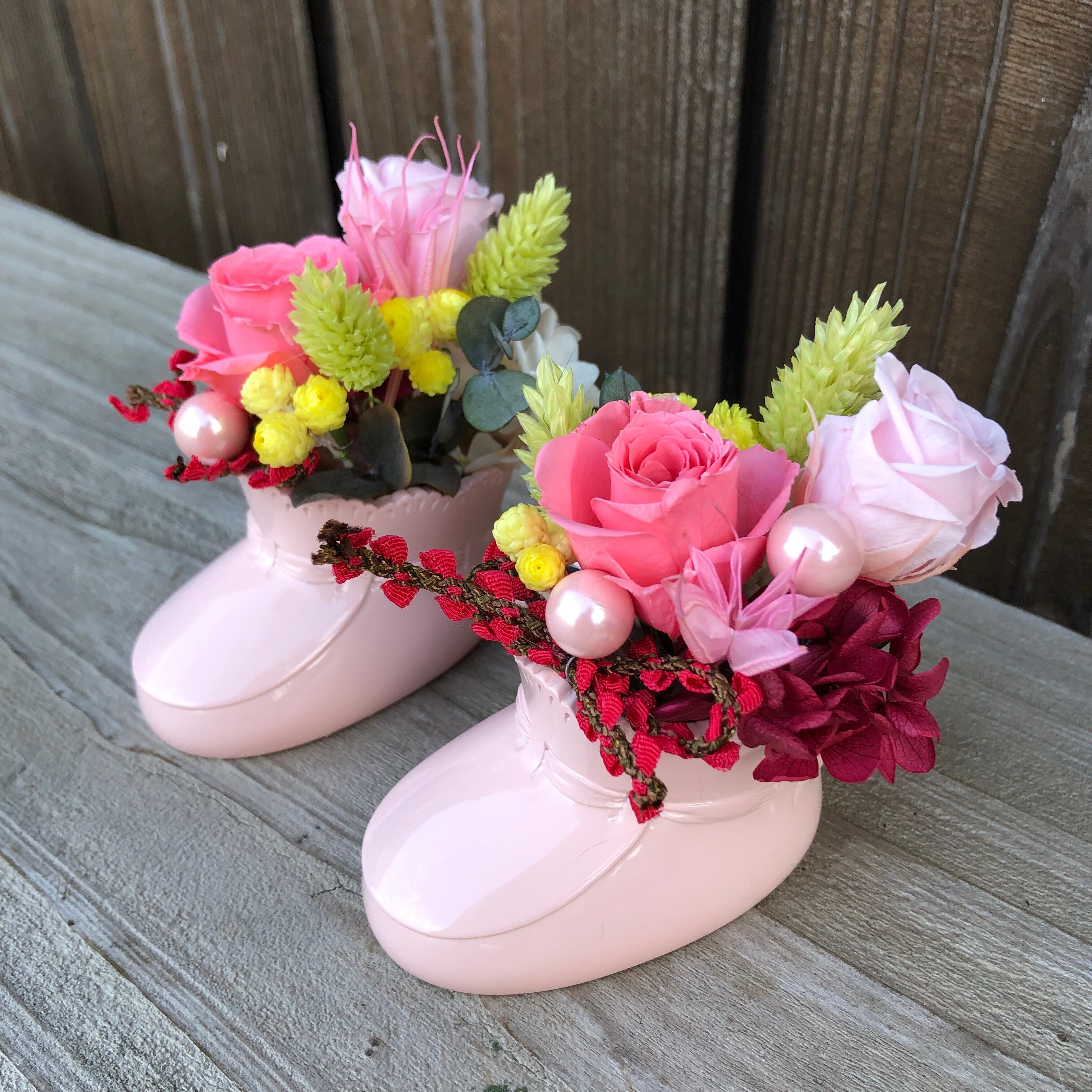 可愛らしいプリザーブドフラワーがあしらわれたベビーシューズ登場!プリザーブドフラワーは、一つ一つ手作りで作られたもので、どれもオリジナルのデザイン。